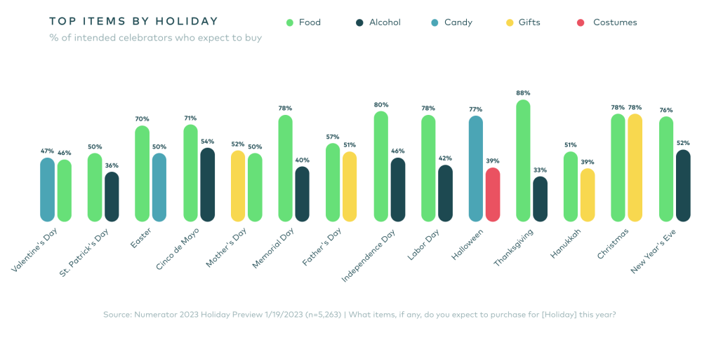Nearly all consumers say they’ll buy various items for their holiday celebrations this year. Food and alcohol are the top two products shoppers plan to purchase across holidays, followed by candy and gifts for select holidays.