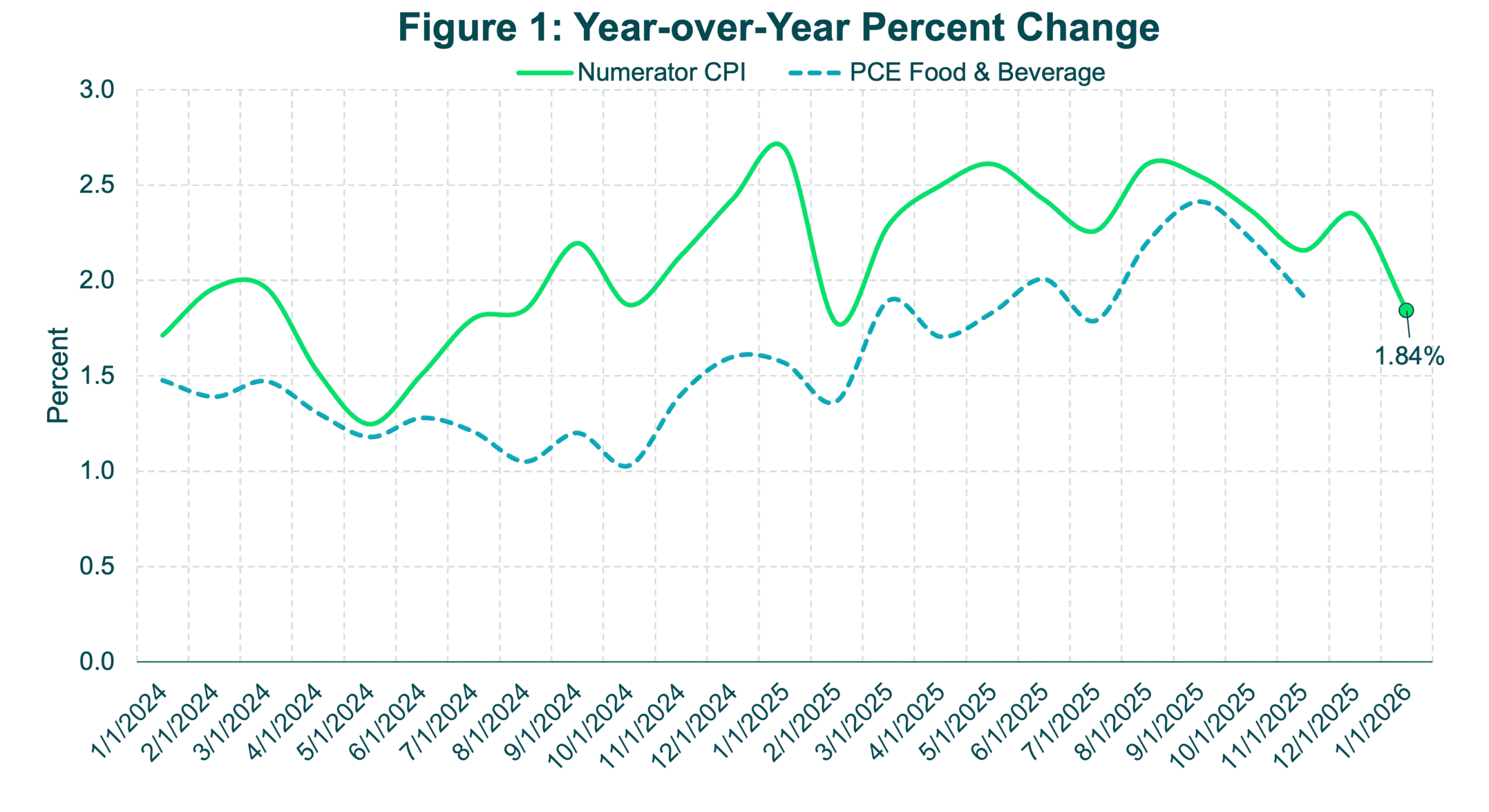 Numerator’s consumer inflation measure is constructed using both base-period and current-period quantity weights to combine item prices, an approach that is consistent with the structure of the U.S. Bureau of Economic Analysis’ PCE Price Index.