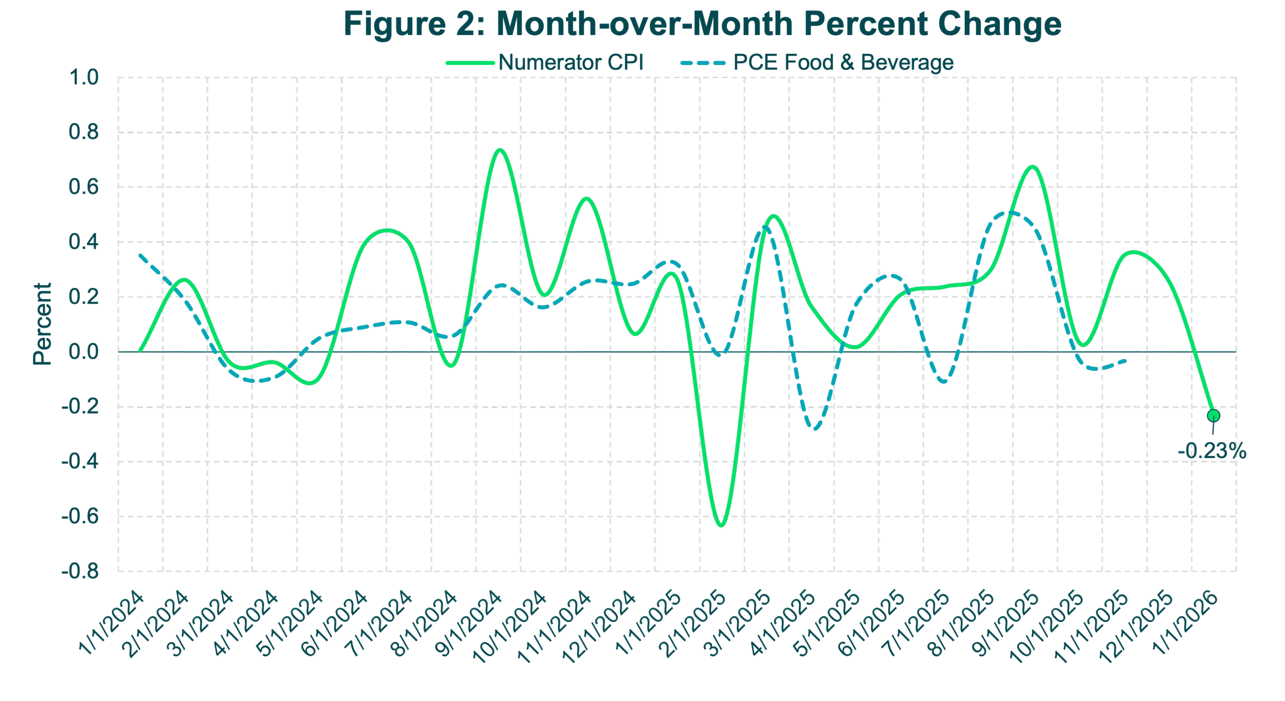 - Prices for everyday household purchases declined 0.23% in January 2026, its first month-over-month decline in nearly a year, after having increased 0.25% in December 2025 and 0.35% in November 2025.