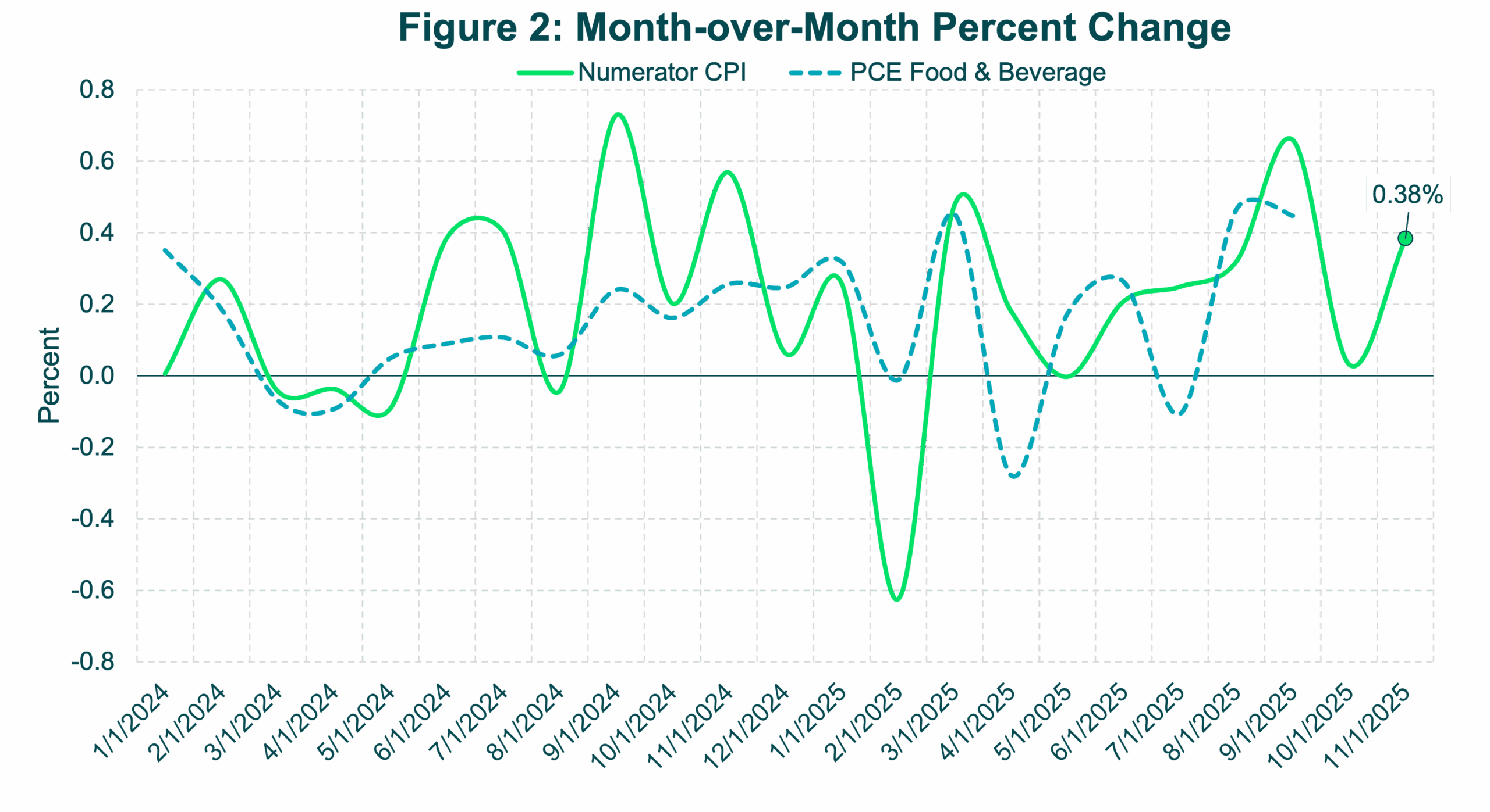 Similar to the U.S. Bureau of Economic Analysis’ Personal Consumption Expenditures (PCE) price index, the Numerator CPI tracks prices and changes in consumer purchases over time. The data cover approximately 20% of the consumption basket captured in the overall PCE price index, and closely tracks the PCE Food & Beverage index, offering a reliable signal of retail price changes experienced by U.S. consumers.