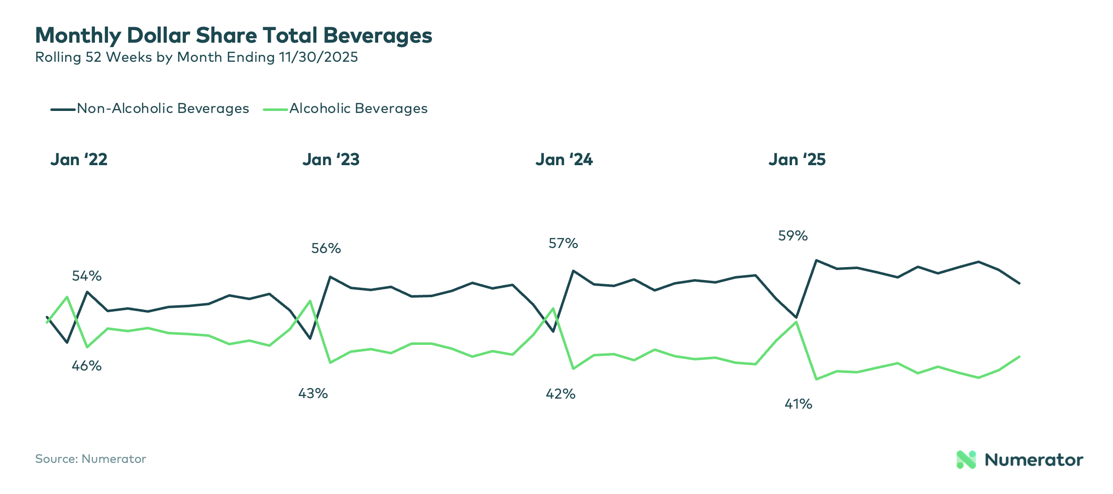 As the new year begins, many consumers participate in Dry January, a month-long commitment to abstain from alcohol. What began as a personal wellness challenge has evolved into a broader behavioral shift, with alcohol’s share of total beverage sales declining each January and rebounding more slowly than in years past. This change is driven not only by Dry January participants but also by heavier alcohol buyers reconsidering their long-term drinking habits.