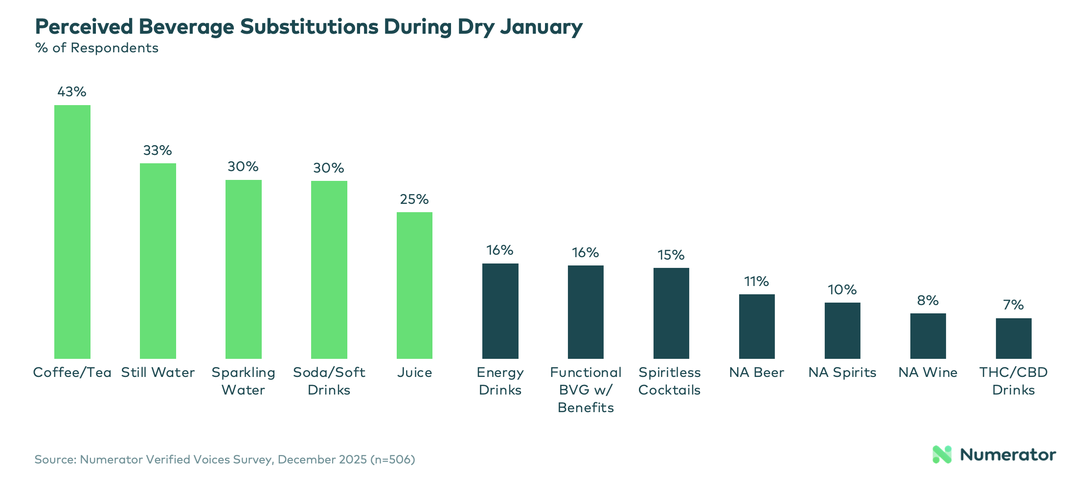 Dry January creates a strong opportunity for functional and non-alcoholic beverages as consumers shift their purchasing behavior and seek alcohol alternatives. In Numerator’s Verified Voices research, more than one-third of participants plan to maintain their usual routines while simply cutting out alcohol, meaning the need for beverage replacements remains. During this period, consumers most often turn to coffee and tea (43%), still water (33%), sparkling water (30%), soda and soft drinks (30%), and juice (25%).