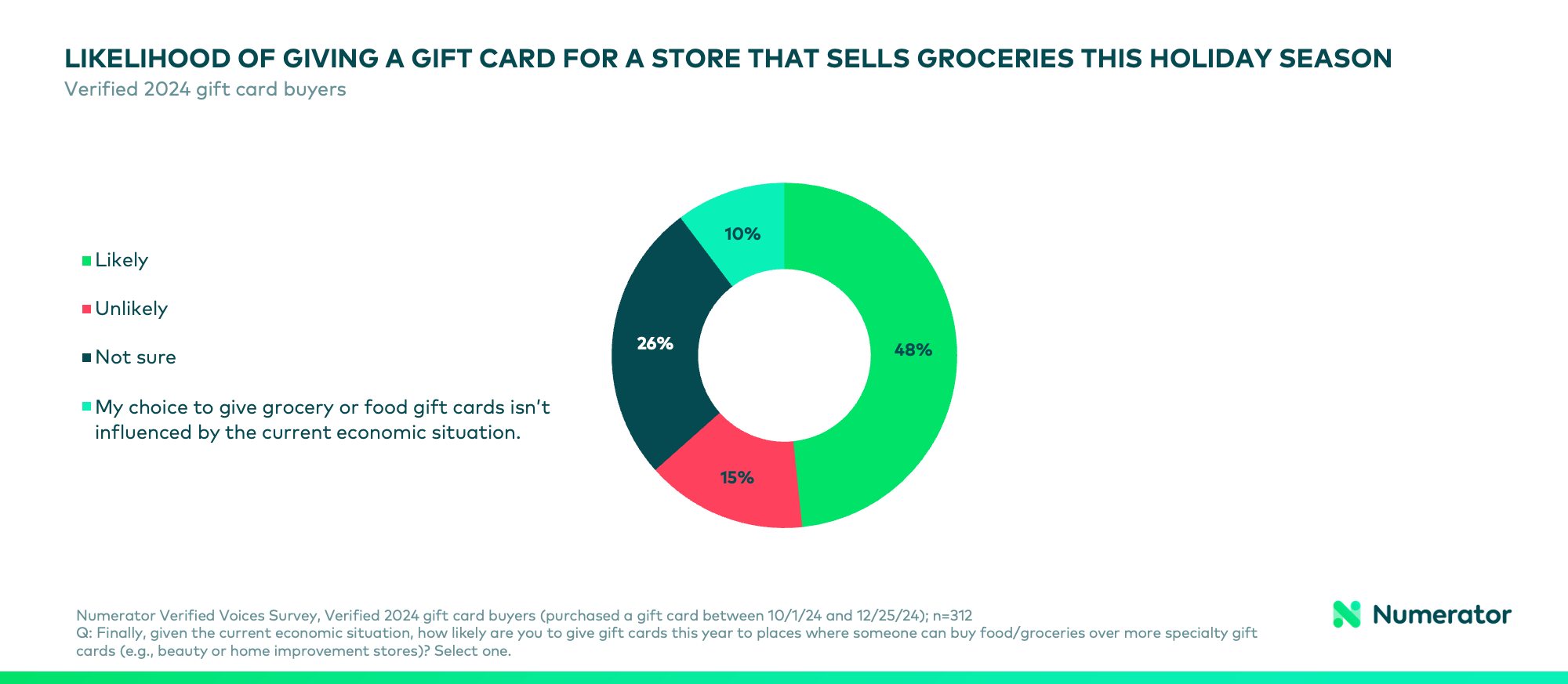 Consumer confidence in the economy remains at a four year low, which is impacting gift card buying behavior: some consumers plan to gift some financial relief for the holidays. Almost half of verified 2024 gift card buyers (48%) say they are likely to give gift cards this year to places where someone can buy groceries. Over 1 in 4 (26%) remained undecided on whether they’d give a gift card to a store that sells groceries.