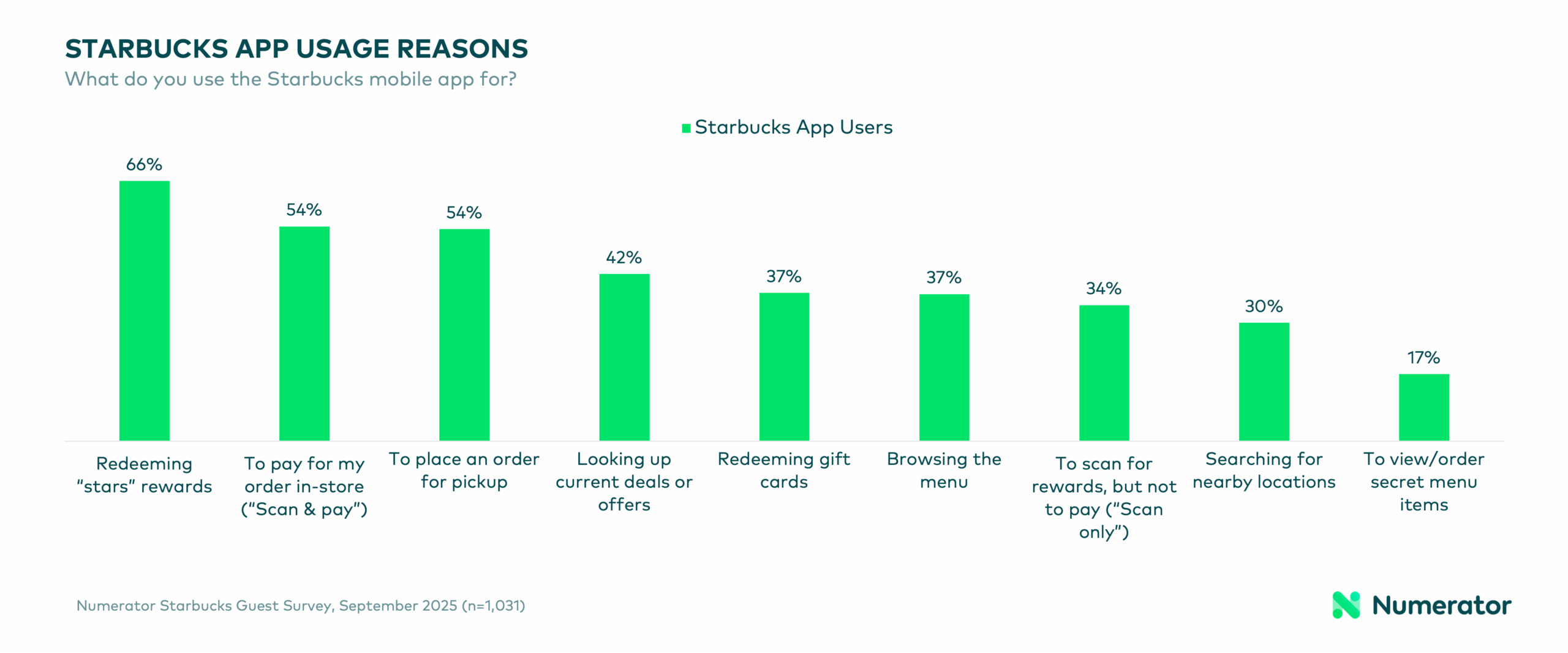 According to Numerator Verified Voices survey data, nearly three-quarters of Starbucks guests have used the Starbucks mobile app before, and more than half (59%) are active users today. Those who don’t use the app say it’s because they don’t visit frequently enough to see the value, with half visiting the coffee chain monthly or less. In contrast, app users are much more loyal and consistent, with 67% visiting at least a few times a month and nearly 3 in 10 (29%) stopping by multiple times a week.