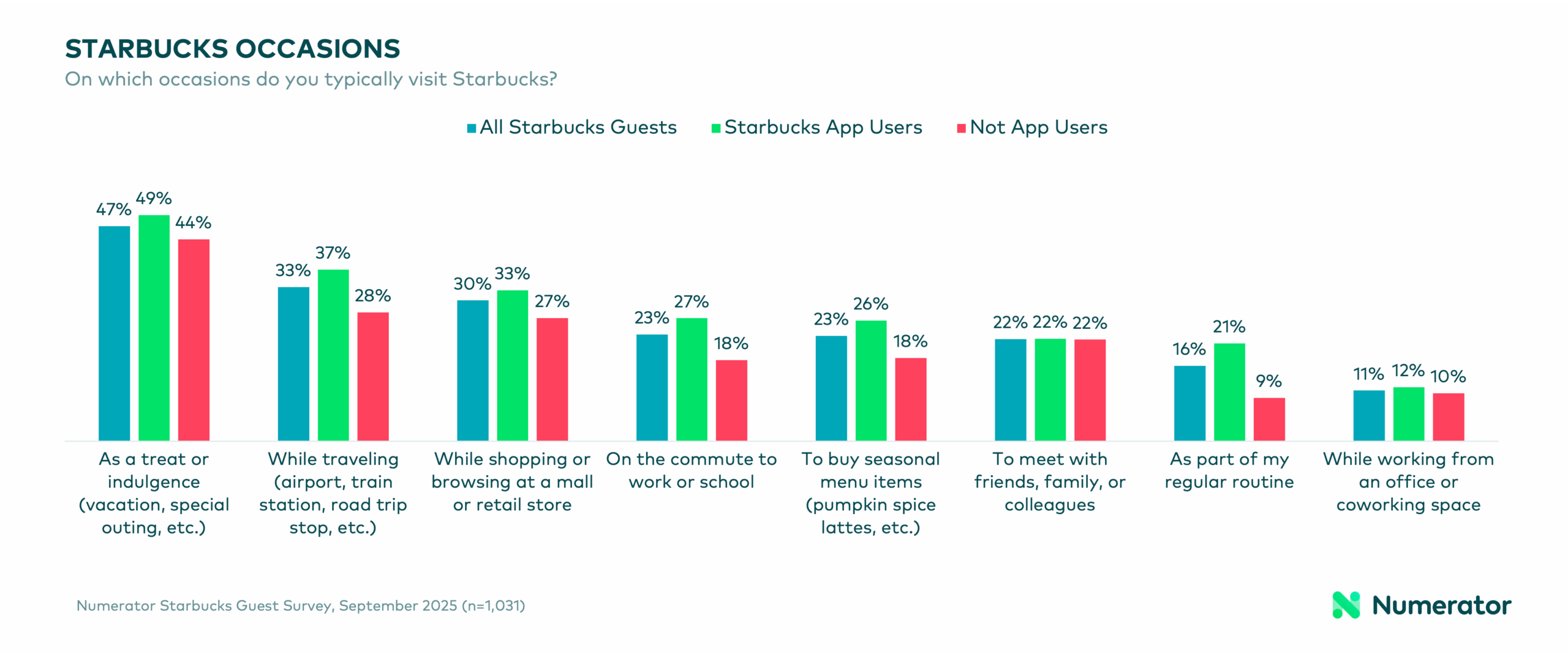 Compared to the average US shopper, Starbucks guests skew higher income, more urban, and are more likely to be Hispanic or Asian Gen X’ers living in the West. App users amplify these core demographics, but are more likely to be Gen Z’ers compared to non-users, a promising sign for future growth and loyalty. In addition to more frequent visits, Starbucks app users visit earlier in the day and are more likely to describe Starbucks as part of their regular routine (+12 pts vs. non-users) or commute (+9 pts). Although most shoppers still view a Starbucks trip as a treat or travel stop, app users weave their visits into everyday rituals.