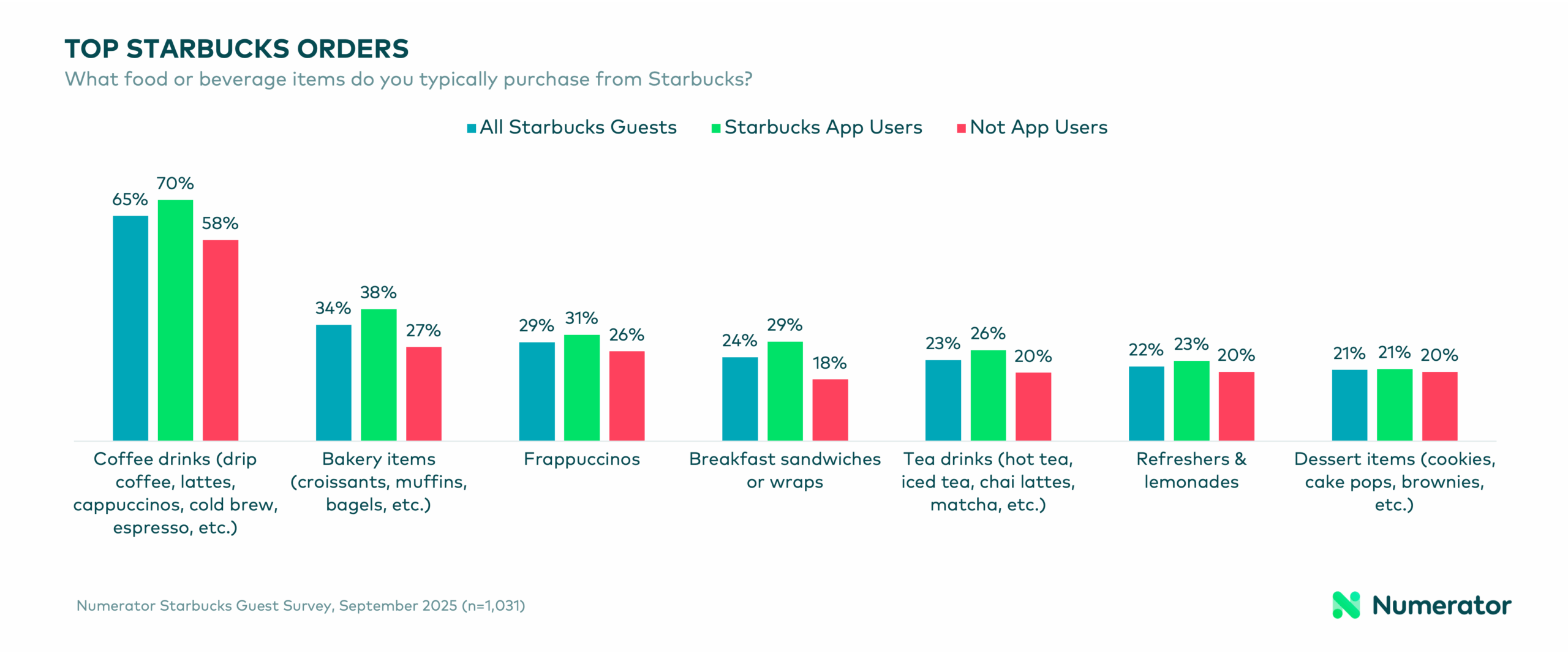 Many Starbucks guests are creatures of habit, but app users are even more entrenched in their ways. 38% of users say they have one standard order and usually get the same thing each time they visit (vs. 30% of non-users), and 54% rotate among a few favorites. Coffee drinks remain the top choice for all Starbucks guest groups, but app users also show a preference for bakery items and breakfast sandwiches & wraps—likely tied to their earlier morning visits.