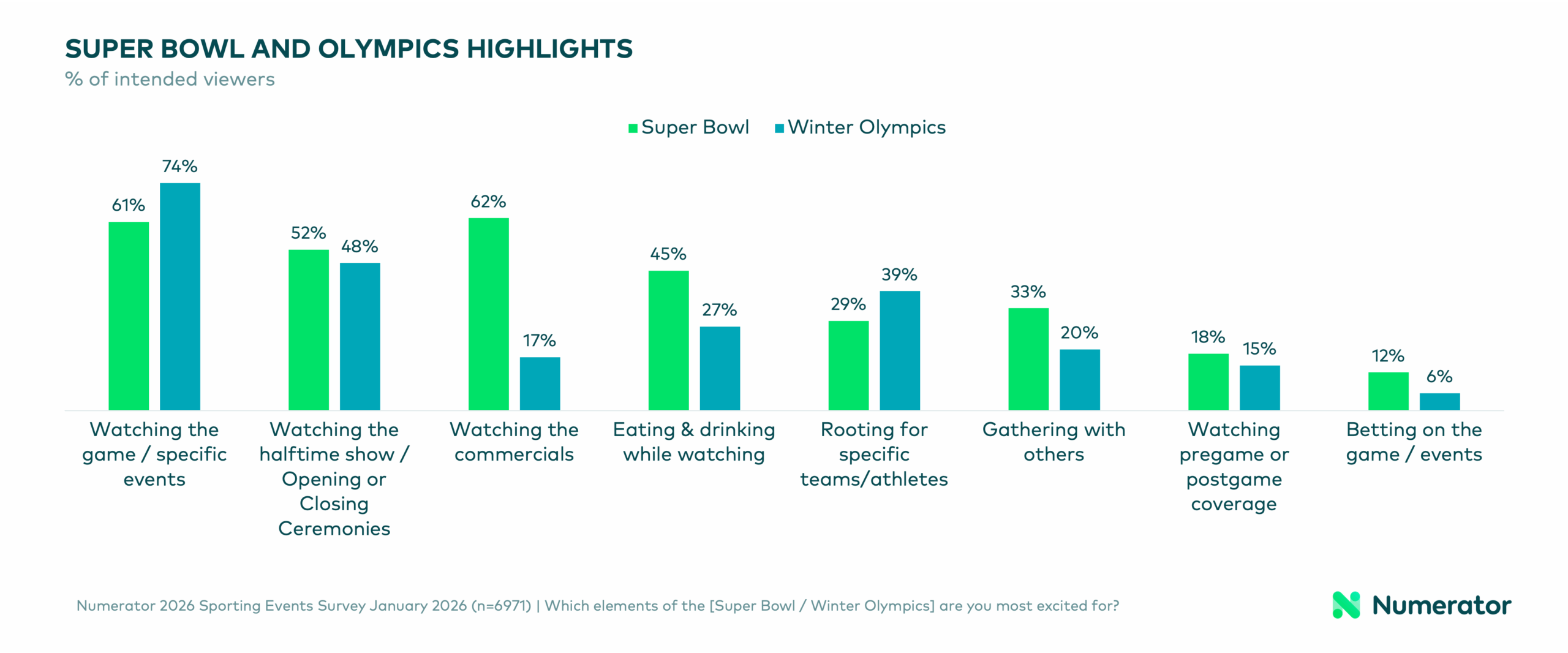 Over time, it seems like the Super Bowl has become less football-focused and more entertainment-driven, with 62% of viewers saying they are most excited for the commercials taking place during Super Bowl LX. Many (61%) are still excited for the game itself, while about half (52%) are looking forward to the halftime show. For the Olympics, viewers are most excited to watch specific events (74%), which is not surprising given that 70% of those planning to watch both the Super Bowl and the Olympics say that the Olympics have the better overall athletes. 48% are excited to watch the Opening and/or Closing Ceremonies (48%), and 39% are ready to root for specific teams or athletes (39%).