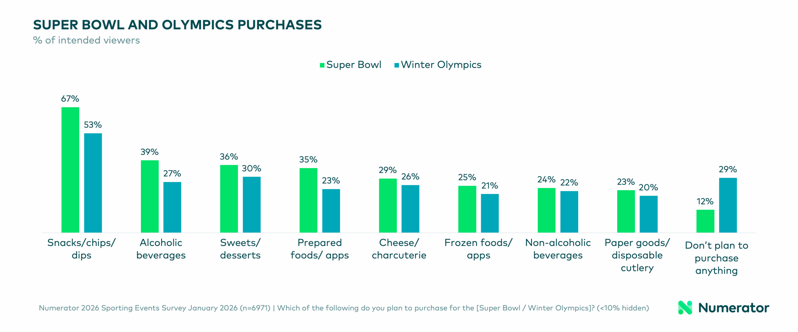 Since viewers are more likely to gather for the Super Bowl, it is expected to drive more consumer behavior than the Olympics. In fact, the Saturday before last year’s Super Bowl was the single-highest day of grocery unit volume in 2025 and was the third-highest day of grocery dollar sales, trailing only the days leading up to Christmas. That spending momentum is reflected in shopping plans, as nearly nine in ten (88%) Super Bowl viewers plan to purchase something for the game, with the top items being snacks/chips/dips (67%), alcoholic beverages (39%), and sweets/desserts (36%). Olympic viewers are slightly less likely to shop but remain engaged with 71% planning to make a purchase, including snacks/chips/dips (53%), sweets/desserts (30%), and alcoholic beverages (27%).