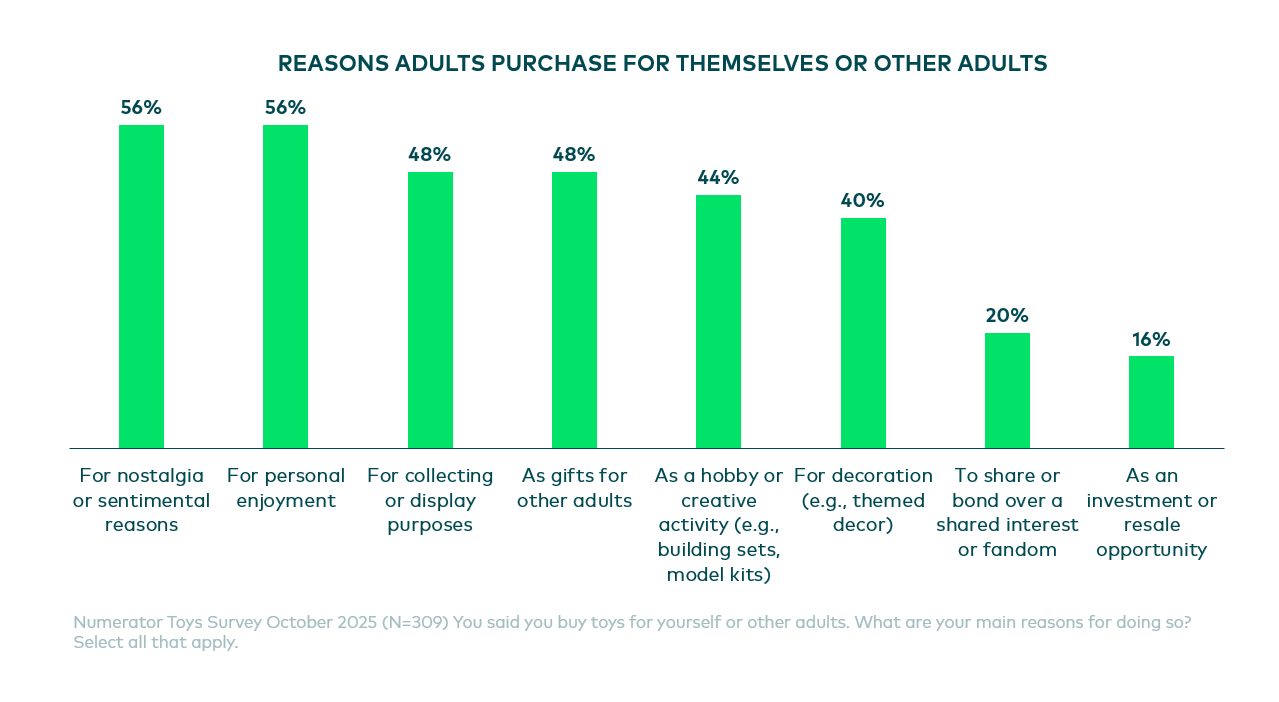 The “kidult” shoppers are driven by a range of motivations, including personal enjoyment (44%), hobbies or creative activities (40%), collecting or display purposes (38%), and nostalgia or sentimental value (36%). Their engagement reflects how the toy industry is evolving beyond play into expressions of identity, creativity, and comfort.