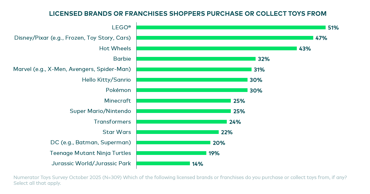 Although Labubu has dominated the toy industry in 2025, continued success will hinge on emotional connection and brand trust. Beloved franchises with established loyalty will maintain their share of spend. The top licensed brands or franchises from which shoppers purchase or collect toys include LEGO (51%), Disney/Pixar (47%), and Hot Wheels (43%).
