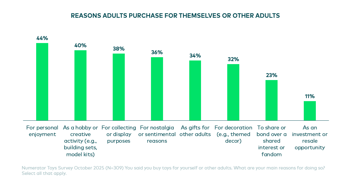 The “kidult” shoppers are driven by a range of motivations, including personal enjoyment (44%), hobbies or creative activities (40%), collecting or display purposes (38%), and nostalgia or sentimental value (36%). Their engagement reflects how the toy industry is evolving beyond play into expressions of identity, creativity, and comfort.