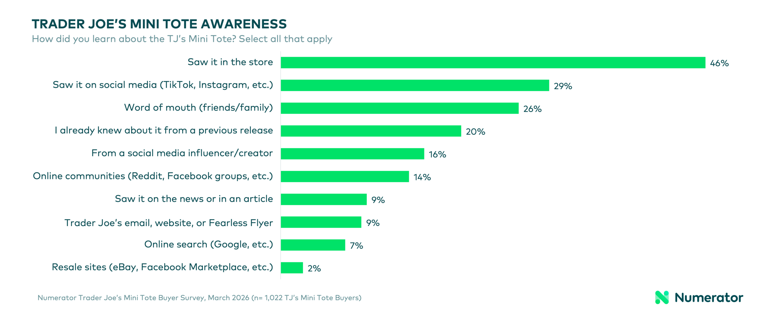 Over half (54%) of mini tote buyers said the “viral” nature of the bag influenced their decision to buy—21% said it was a major factor and 33% a minor factor. Gen Z and Millennial buyers were much more likely to cite virality as influential (68% and 58%, respectively). 16% of buyers were not aware that the bag was viral before purchasing. Most buyers initially found out about the totes by seeing them in the store (46%), followed by social media (29%) and word-of-mouth (26%). 2026 buyers were also more likely to know about the tote bags from previous releases (23%).