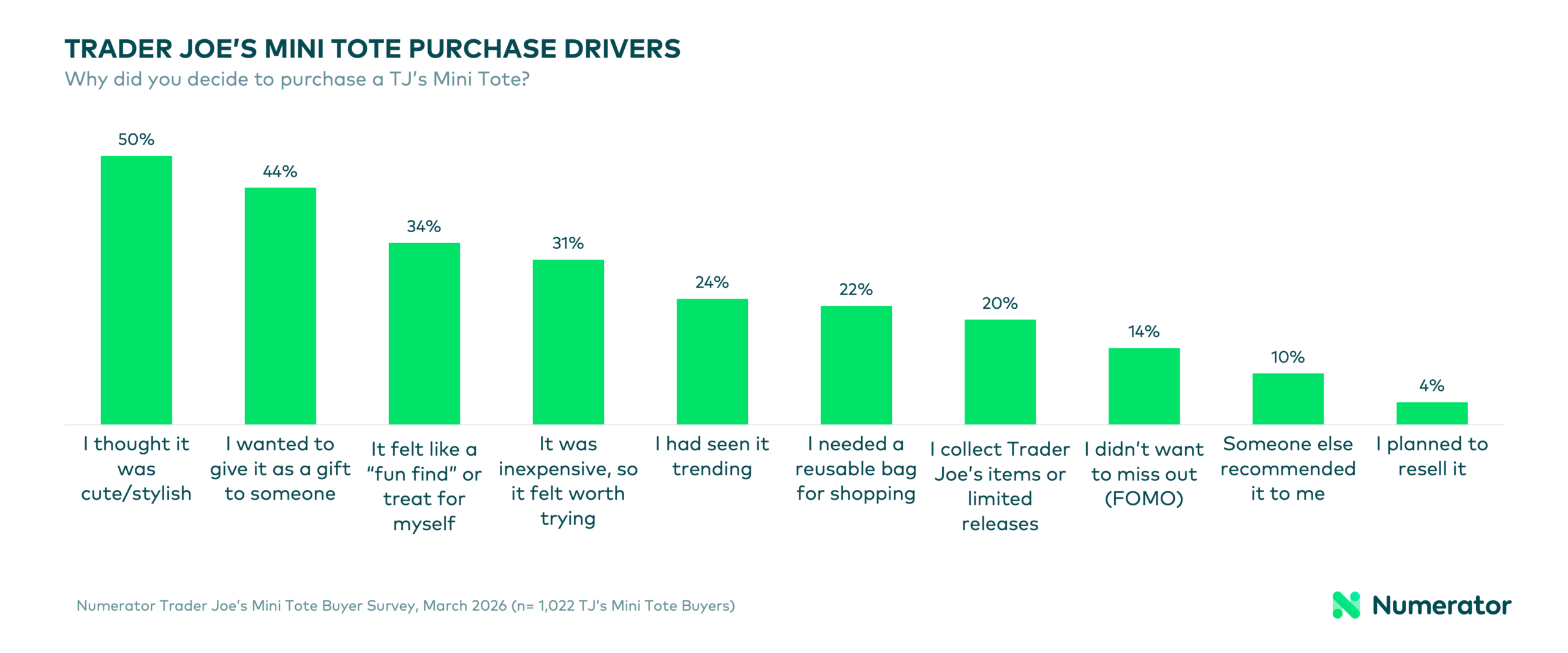 Novelty and aesthetics drove many TJ’s mini tote purchases. The top reasons shoppers cited for buying a mini tote were thinking it was cute/stylish (50%), to give as a gift (44%), because it felt like a “fun find” or a treat (34%), or because it was inexpensive and felt worth trying (31%). Gift giving was much more popular among 2026 mini tote buyers, the majority of whom bought the pastel mini canvas totes. Mini tote buyers reported feeling happy (58%), excited (33%), or trendy (24%) after their purchases.