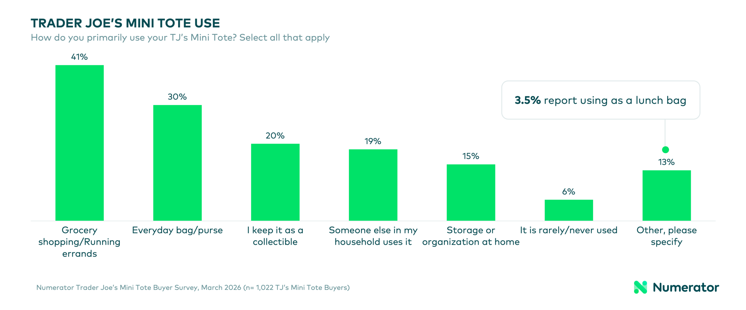 Most mini tote owners are using their bags for grocery shopping and running errands (41%), as an everyday bag/purse (30%), or keeping it as a collectable (20%). Many also shared that they’re using them as lunch bags or Easter baskets. Nearly a third (30%) of TJ’s mini tote buyers currently own five or more of these bags, emphasizing both their collectable nature and affordability. When asked what they liked most about their mini totes, buyers mentioned the cute design, compact size, affordability, and versatility.