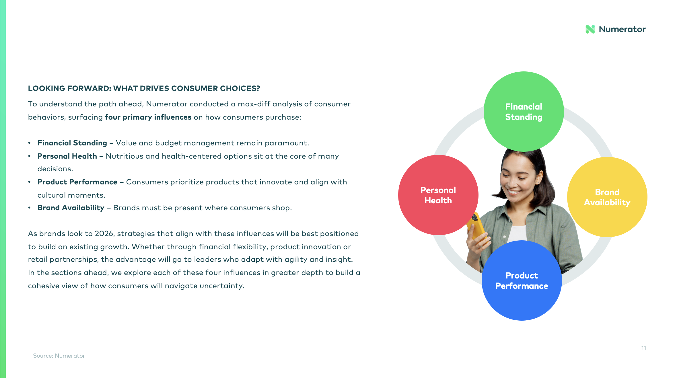 To understand the path ahead, Numerator conducted an analysis of consumer behaviors through a max differential, revealing four primary influences in how consumers purchase. As brands look to 2026, aligning strategies with these influences can help build on growth. Whether through financial flexibility, product innovation, or retail partnerships, the future belongs to those who can adapt with agility and insight.